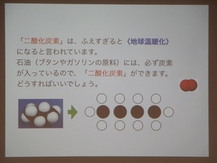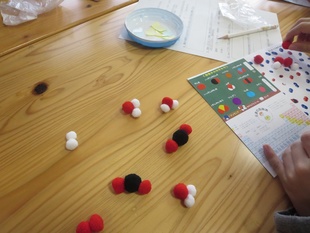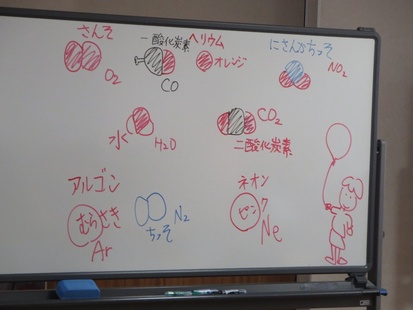 わかりやすく、シールを貼ったり、フェルトのボールを使って原子模型を作ったりしました。