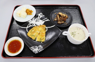 メニューは、さつま芋入りご飯のおやき風、なすとツナの味噌焼き、うま味豆乳スープ、にんじんのケーキです。大学生が考案して食品の皮を捨てずに使うなど、食品ロス削減に取り組んだメニューになっています。