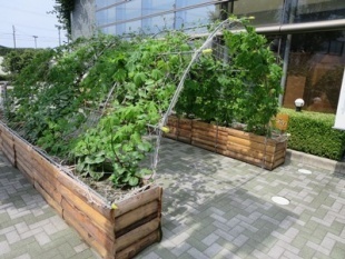 「ゴーヤ」「ツルムラサキ」がすくすく伸びて、トンネルらしくなってきました。