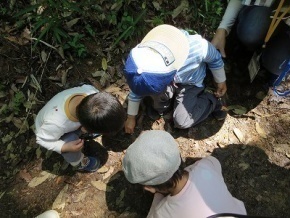 森の中入ると子どもたちは、土の上を走る虫たち、赤いかわいい木の実に夢中。