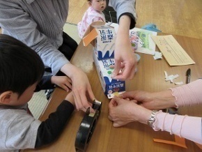 親子で牛乳パックを使ってワンちゃん作り。