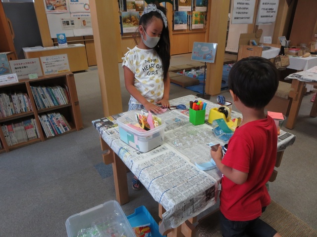 プラスチック製の廃材を利用して、海の生きものを工作し、竹竿で釣って遊びます。