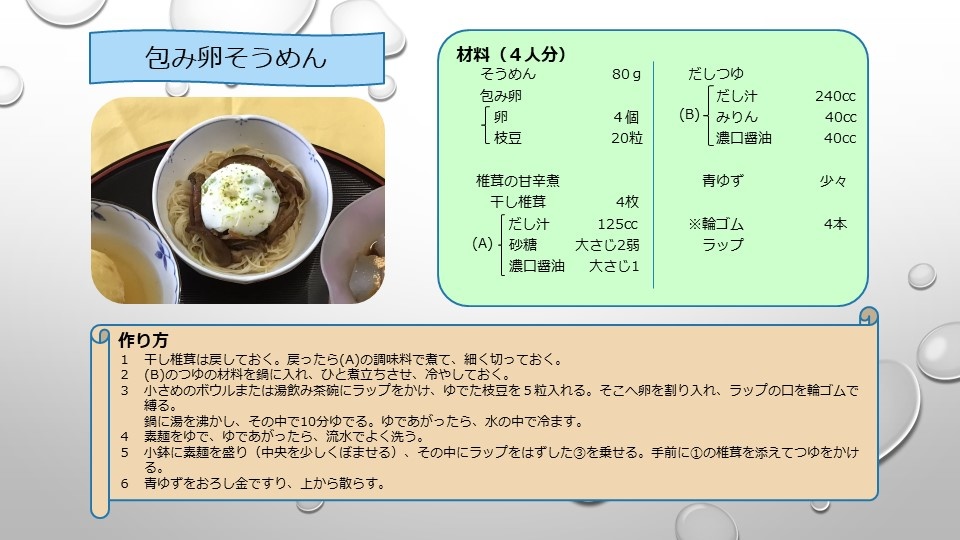 エコットの講座「暮らしを楽しむ講座 夏のおもてなし料理」第3弾「包み卵そうめん」をご紹介します。枝豆を卵で包み、そうめんとともに食べるとふんわりした卵の食感とつるつるしたそうめんの食感が同時に楽しめます。ラップを使ってたまごをうまく茹でるのがコツです。今回も小瀧先生がとてもわかりやすく教えてくださいました。最後に青ゆずをかけるととてもいい香りで食欲が湧きました。