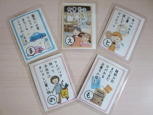 基本的にルールは普通のかるたと一緒ですが、末尾の文字が表示してあるので最後まで聞かないとお手付きになるかも?