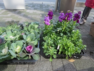 植える花の種類は、葉ボタン・ストック・ノースポール・ブラキカム・ビオラ・アリッサム、そして去年咲いた花が種となって芽が出たイオノポシジウムを植えました。