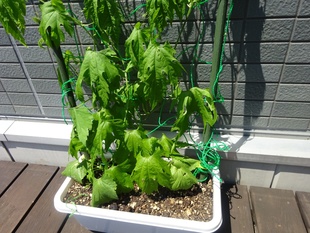 それから、下の写真が約1か月後の6月初めの成長記録です。講師の先生に教えていただいたように、摘芯をしていい感じに横にも広がって伸びています。やったー順調!順調!