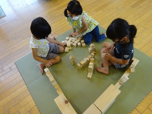 今日は、7月最後の「積み木キャラバン隊」。こども園の皆さんと楽しんで来ましたよ。