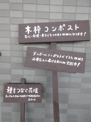 エコットの駐車場に置いてある木枠コンポストと種をつなぐ花壇の看板を作りました。