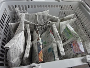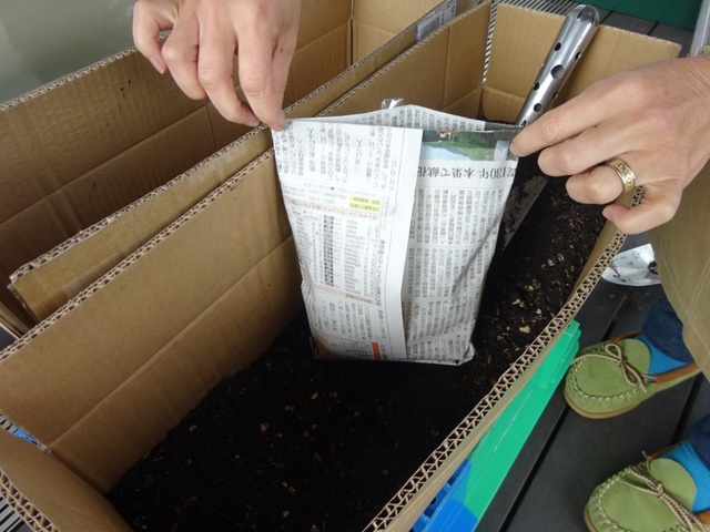 この新聞の袋のまま土の中に植え替えても新聞は土に返ります。いいですね。
