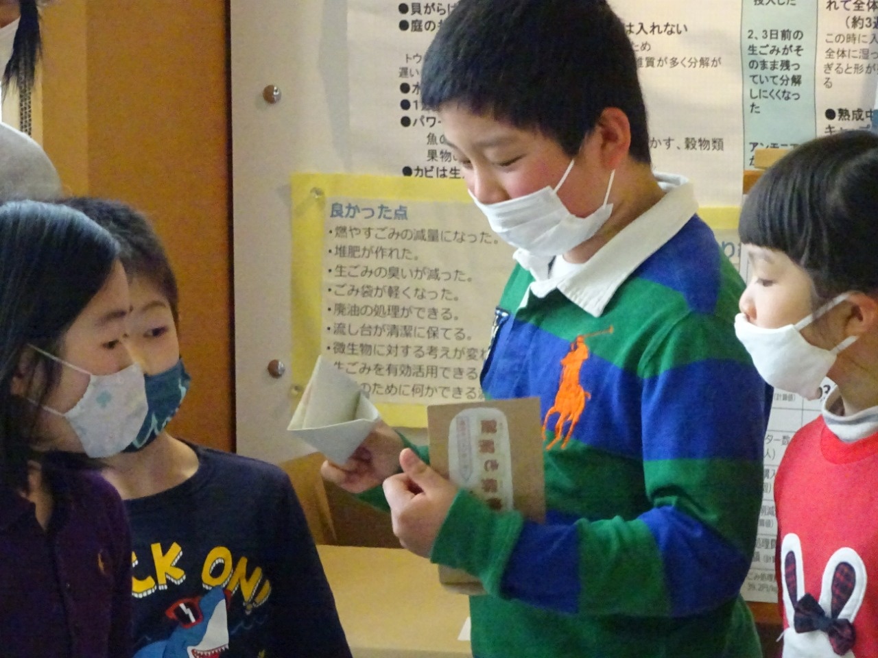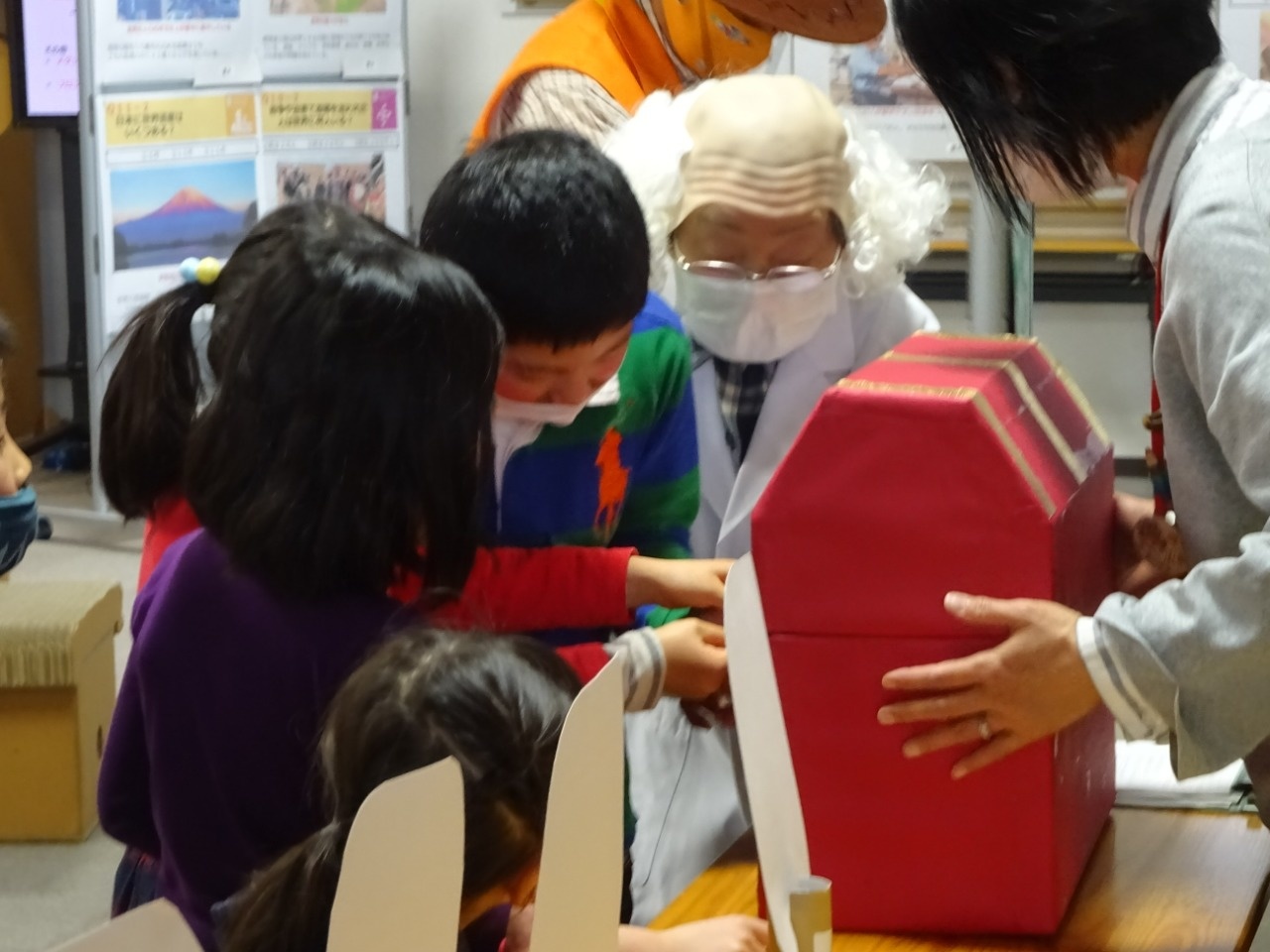 「コンポスト?」とみんなで展示室を探すとダンボールコンポストがあるではありませんか!