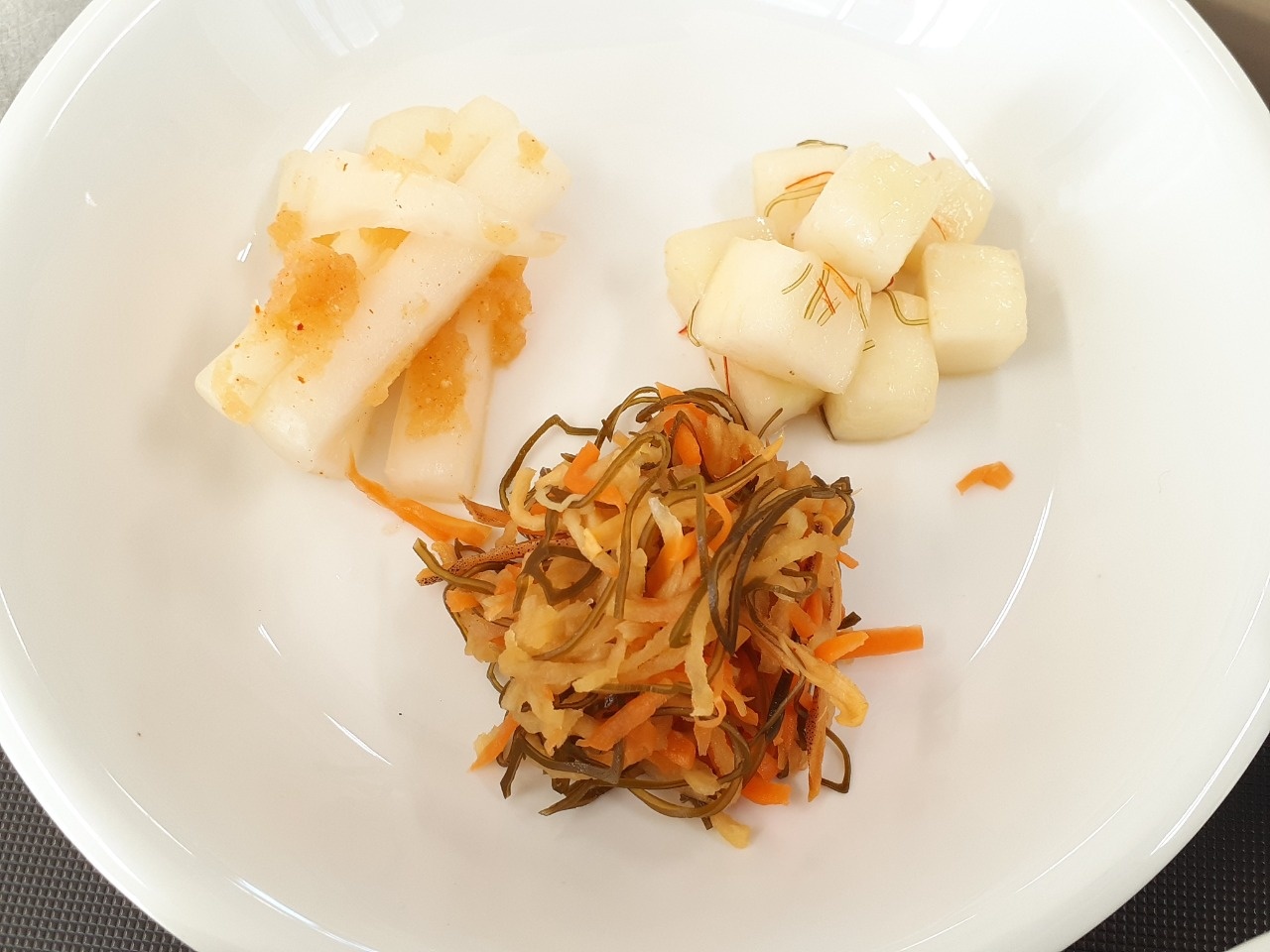 お漬物でも色んな種類がありますが、今回作るのは「松前漬け」と「干し大根の甘酢漬け」と「カクテキ」です。