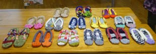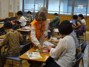 家でいらなくなった布を使って布ぞうりを作ります。最初は四苦八苦していた参加者もだんだん慣れてきてスムーズに編めるようになっていました。ちょっとしたコツがありますね!