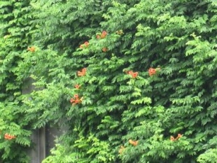 エコットの壁面に西洋ヅタやノウゼンカズラが植えてあります。ノウゼンカズラには、オレンジの花が付き始めました。これからどんどん増えていきます。