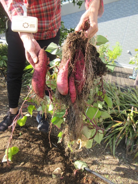 3階のウッドデッキで、土のう袋に土を入れサツマイモを育ててきました。