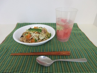 メニューは野菜たっぷりの焼きそばとスイカパンチです。