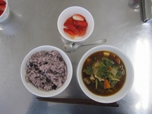 みんなの力で早く作り終わったので、食べている間に、「あか・きいろ・みどり」の食べ物のお話。1回の食事でバランスよく食べることが、健康な体を作るきっかけになるんだって。