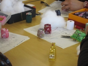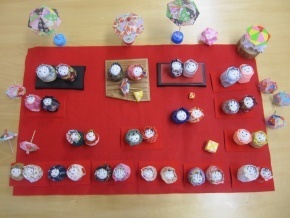 おひなさまに着せる着物も思い思いの布で机の上が華やかです。