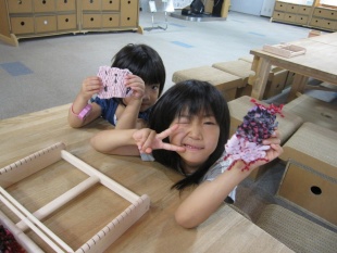 頑張って作ったコースターと一緒に「ハイ、ポーズ」