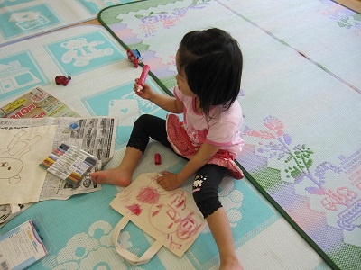 スタンプで手形をつけたり、好きな絵をかいたり 思い思いの素敵なバッグができました!