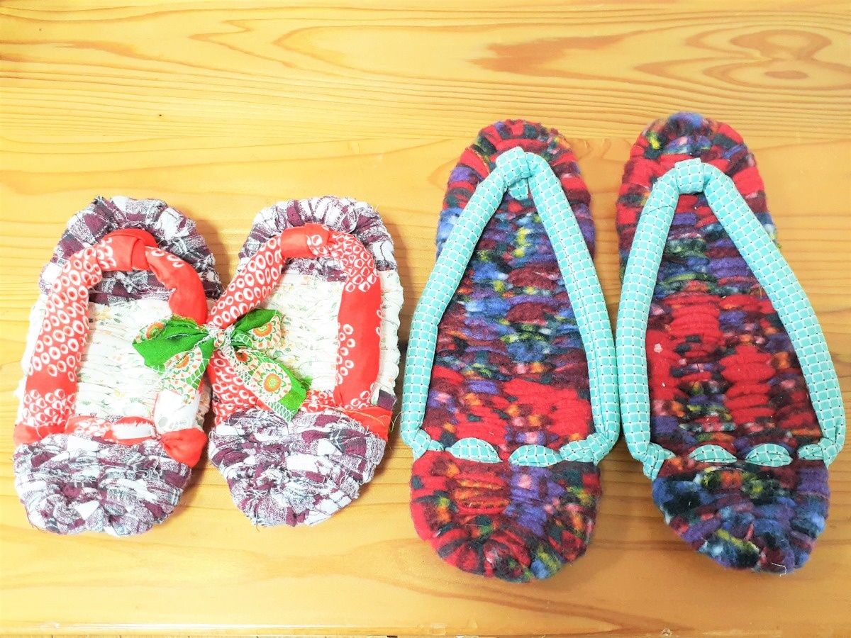 持ち物:裁縫道具(針・糸。7~8号のかぎ針)、裁ちばさみ、幅5~6㎝・長さ150センチの古布(シーツ・布団の表布・衣類など)20枚程度、鼻緒用の布(幅5~6㎝・長さ80㎝)2枚、前緒用の布(幅5~6㎝・長さ40㎝)2枚、ものさし、レジャーシート、座布団、親指が分かれている靴下