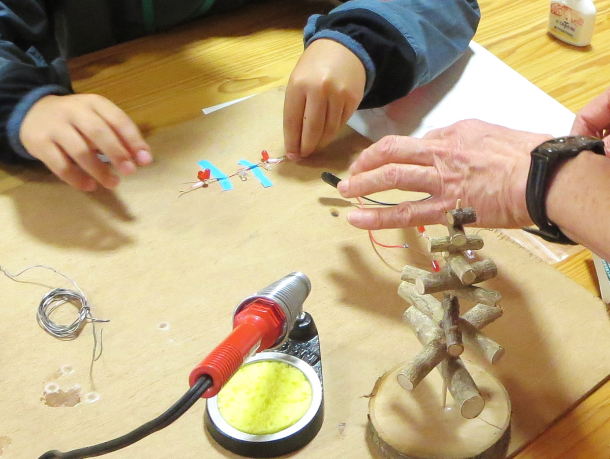 LEDって?はんだごてと森の小枝を使って、ミニクリスマスツリーを作ります。